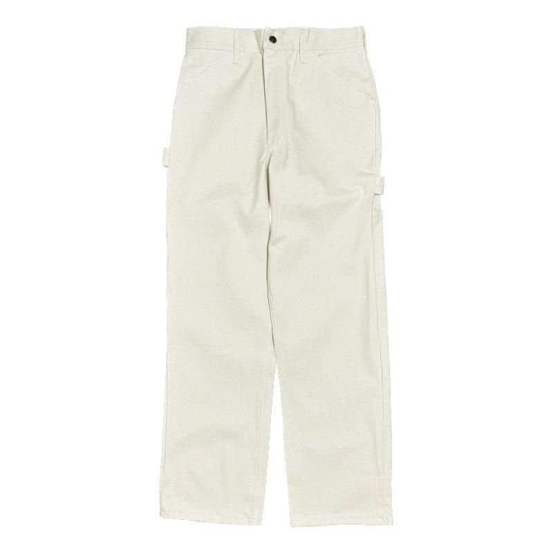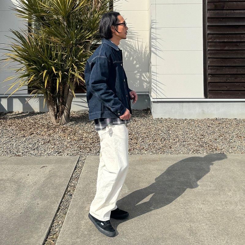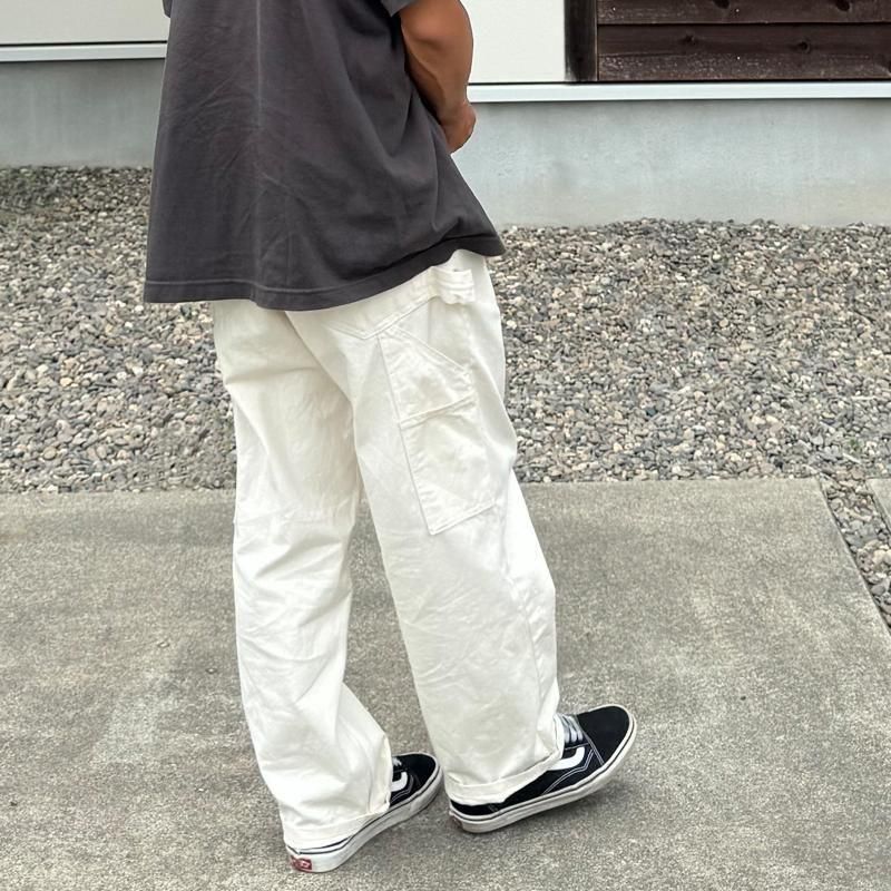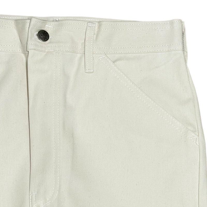 シングルニー(膝が一枚生地)のオーソドックスなペインターパンツで、両サイドにはハンマーループやツールポケットが配置されています。トリプルステッチを採用した縫製で、MADE IN USAらしいタフな作りが特徴です。一般的なツイル生地よりもややライトオンスの生地を使用していますので、春先〜夏場、通年を通して穿いて頂けます。シルエットは太過ぎず細過ぎず、絶妙なシルエットで、コーデにも組み込みやすいシルエットです。カラーはNATURAL (ナチュラル)やや生成りがかったホワイトで落ち着いたカラーです。