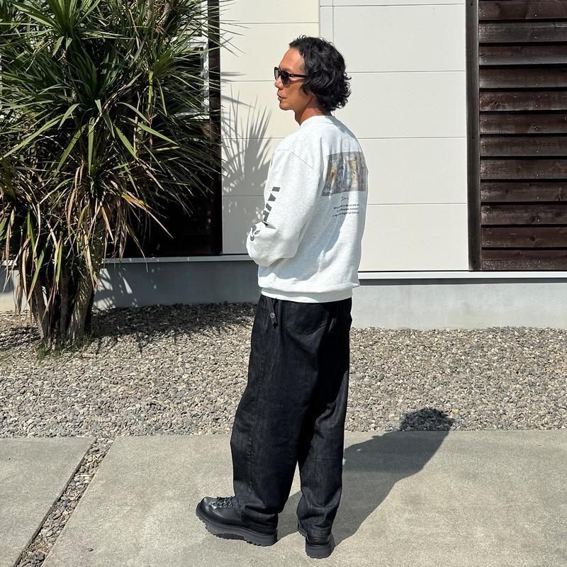 絶妙な古着感を出すために、あえてピグメント(顔料)加工にはせずに製品反応染めにてウォッシュ加工されています。太めで存在感あるリブはシングルステッチ。がっしり厚みある生地ながらゴワつくことなく安心の伸縮性があります。また、洗えば洗うほど生地が馴染み絶妙なエイジングが味わいになり、アメリカ古着を彷彿とさせるアームホールに、ゆったり感があるボックス型シルエットが特徴的です。