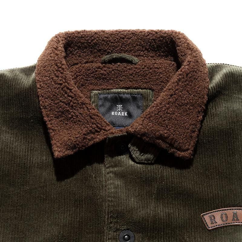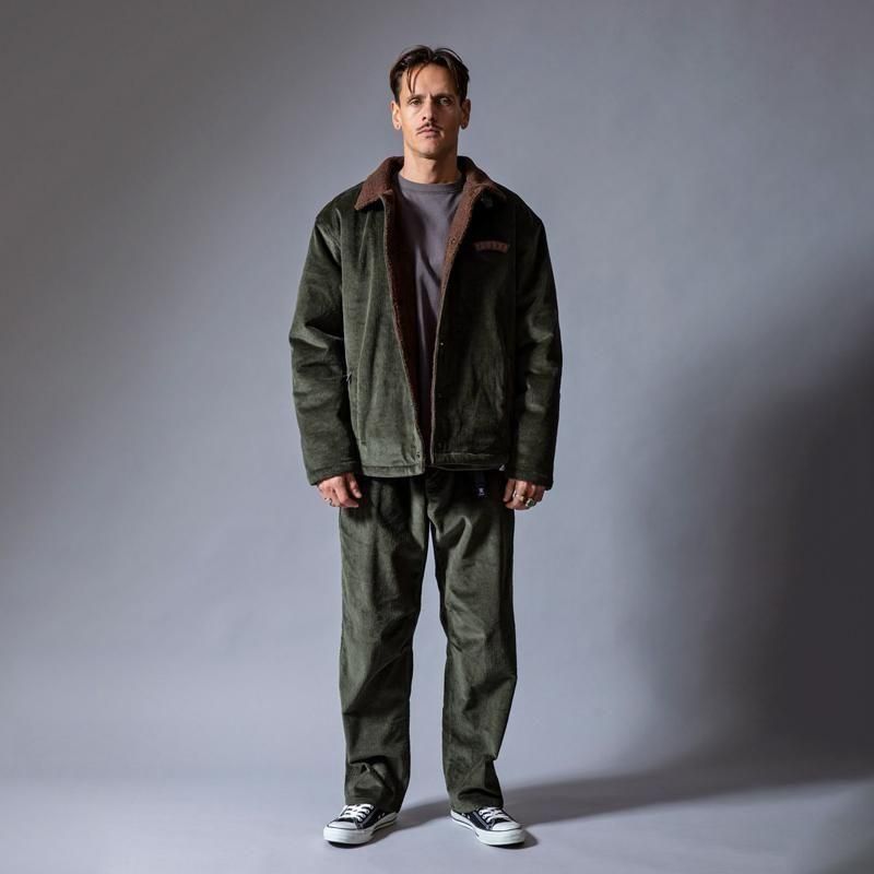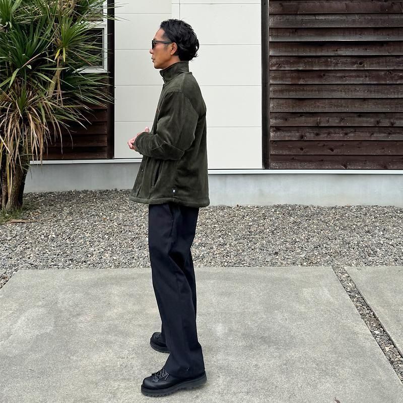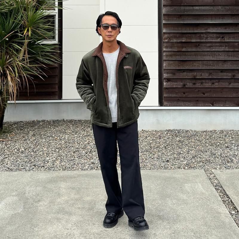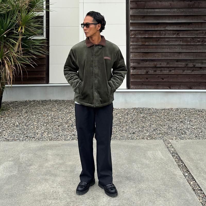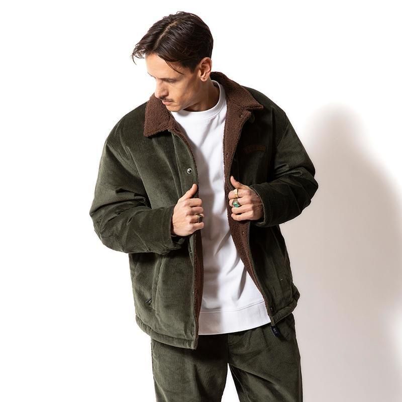 表地にはコーデュロイ生地を使用し、裏地にはポリエステル素材のボアフリースを採用。襟元のボアフリースはチンストラップを留めることで首元を暖めます。裾口はラウンドカット仕様で、シャツジャケットのようなシルエットも持ち合わせたジャケットです。ややゆったりとしたサイズ感で、ストレッチの入ったコーデュロイ素材は着心地も抜群です。