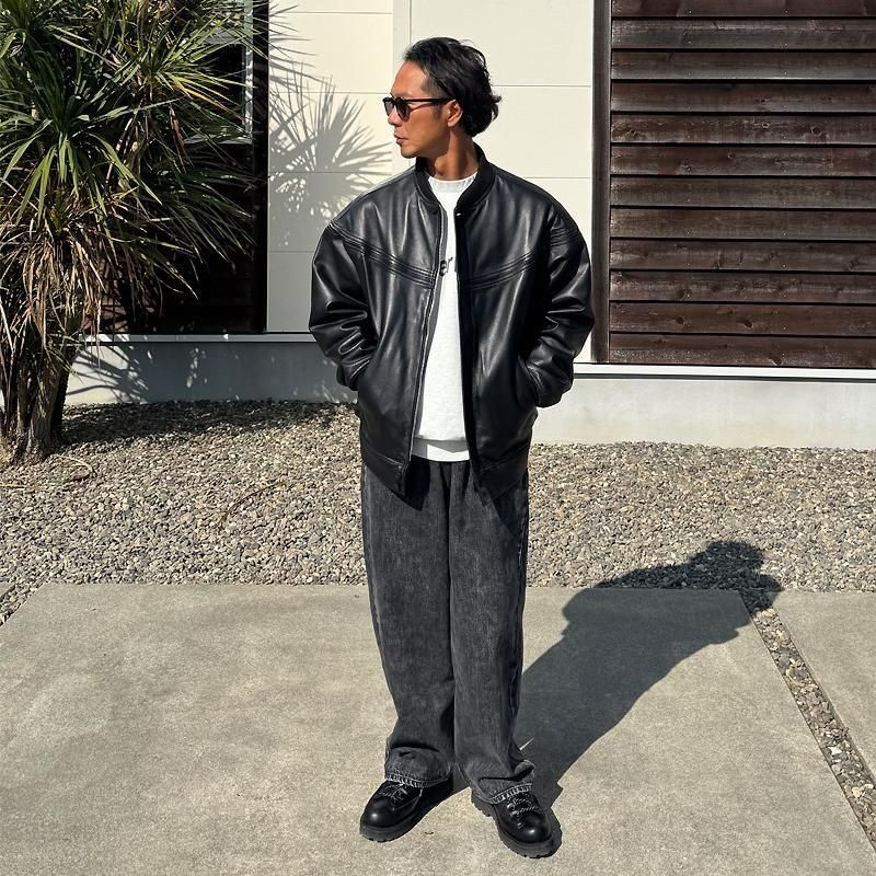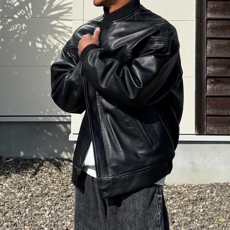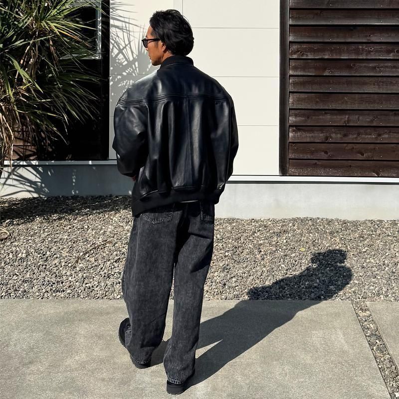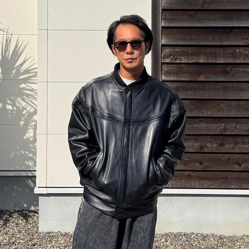 表生地には柔らかくしっとりとしたシープスキンを使用。レザー特有の重厚感のある見た目に反して、軽く滑らかなため、落ち感も楽しめる素材となっています。フロントジップは、米軍に納入実績のある、創業1936年から続くアメリカ「IDEAL社」製のファスナーを使用。裏生地にはポリエステルサテンを使用し滑りを良くし、様々なインナーを着やすくしています。