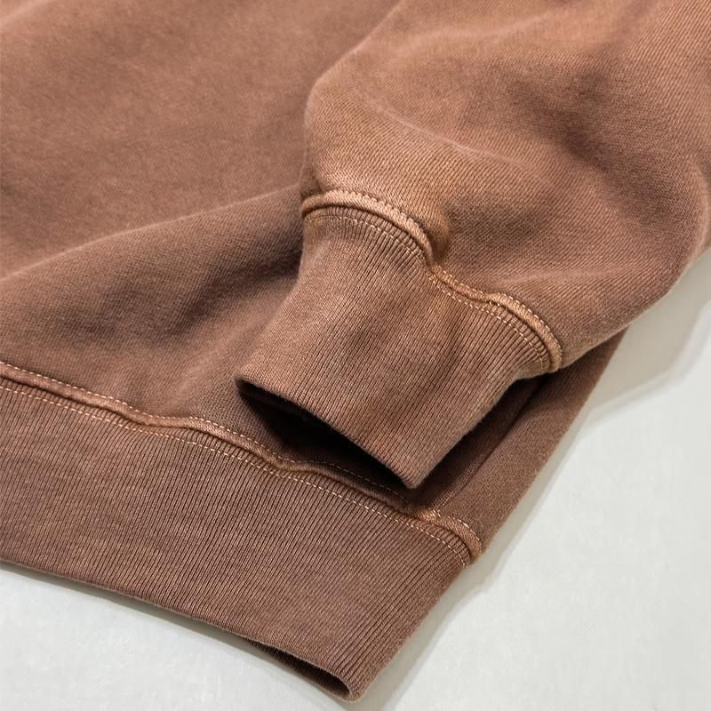 生地にはピグメント加工を施し、生地が柔らかく、軽量さがある為、アウターとの組み合わせでもノンストレスで着用いただけます。裏起毛なので、保温量も高いアイテム。
