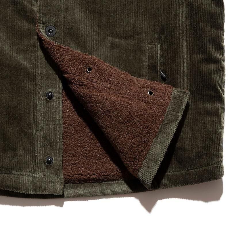 表地にはコーデュロイ生地を使用し、裏地にはポリエステル素材のボアフリースを採用。襟元のボアフリースはチンストラップを留めることで首元を暖めます。裾口はラウンドカット仕様で、シャツジャケットのようなシルエットも持ち合わせたジャケットです。ややゆったりとしたサイズ感で、ストレッチの入ったコーデュロイ素材は着心地も抜群です。